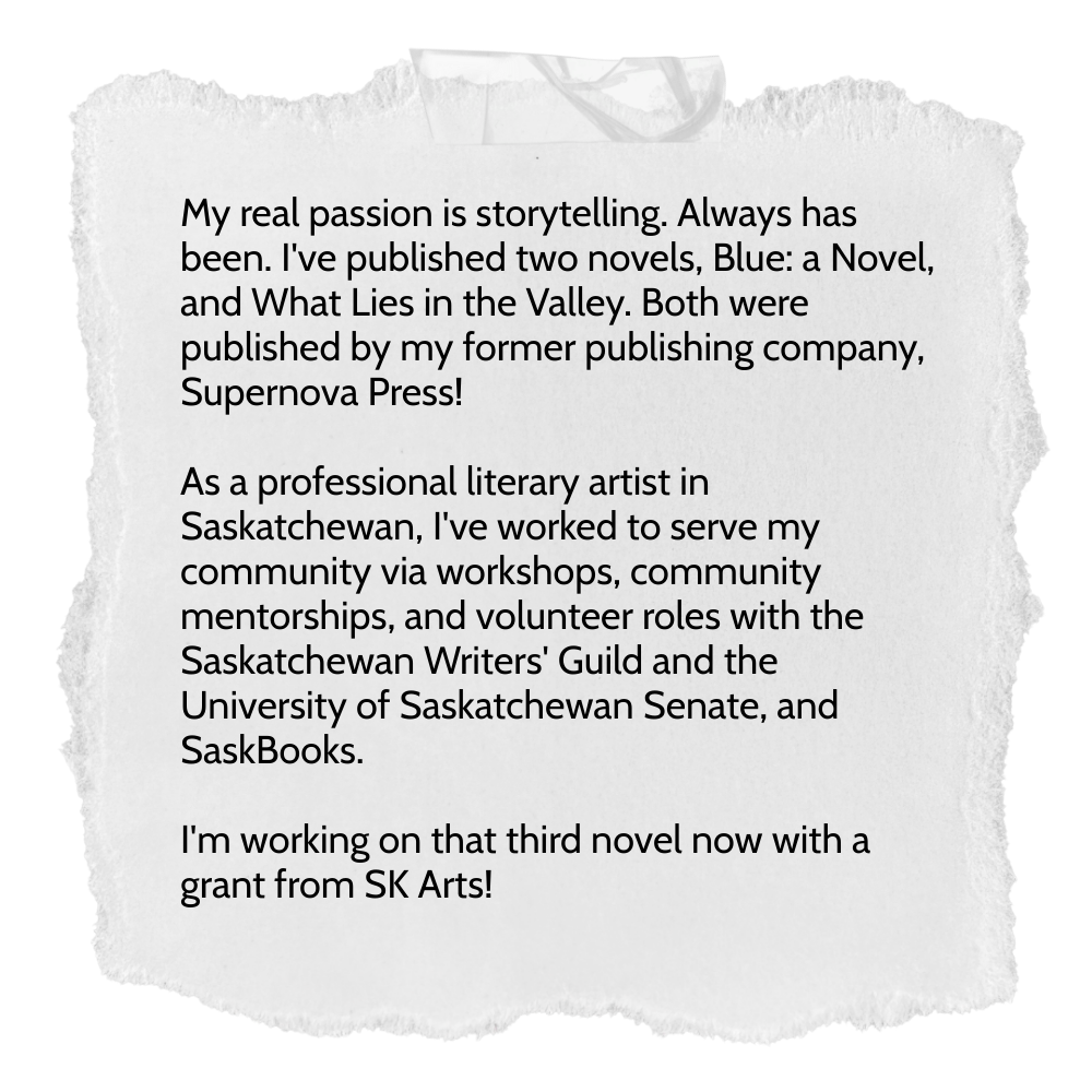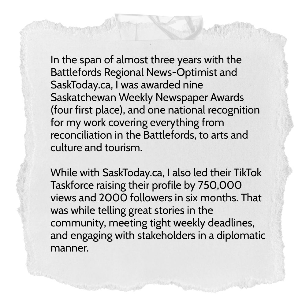 Most recently, I was the founder and part-time Executive Director of the inaugural Biggar Old Time Music Festival, the award-winning Editor of the Battlefords Regional News-Optimist, and the Marketing & Communications Manager at SaskMusic.