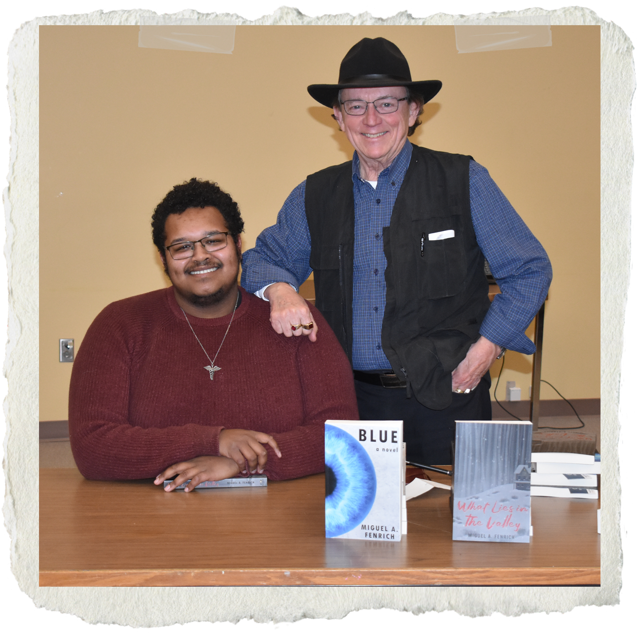 ![acting [ID: A portrait of Miguel A. Fenrich with books in the distance behind him that include his novels 'Blue'; and 'What Lies in the Valley'. He has curly black hair, black glasses, his light brown skin, a black moustace and light beard, and is wearing a black t-shirt with an open textile-themed dress shirt. He is smiling. End.]](https://www.miguelfenrich.ca/wp-content/uploads/2026/01/acting.png)
